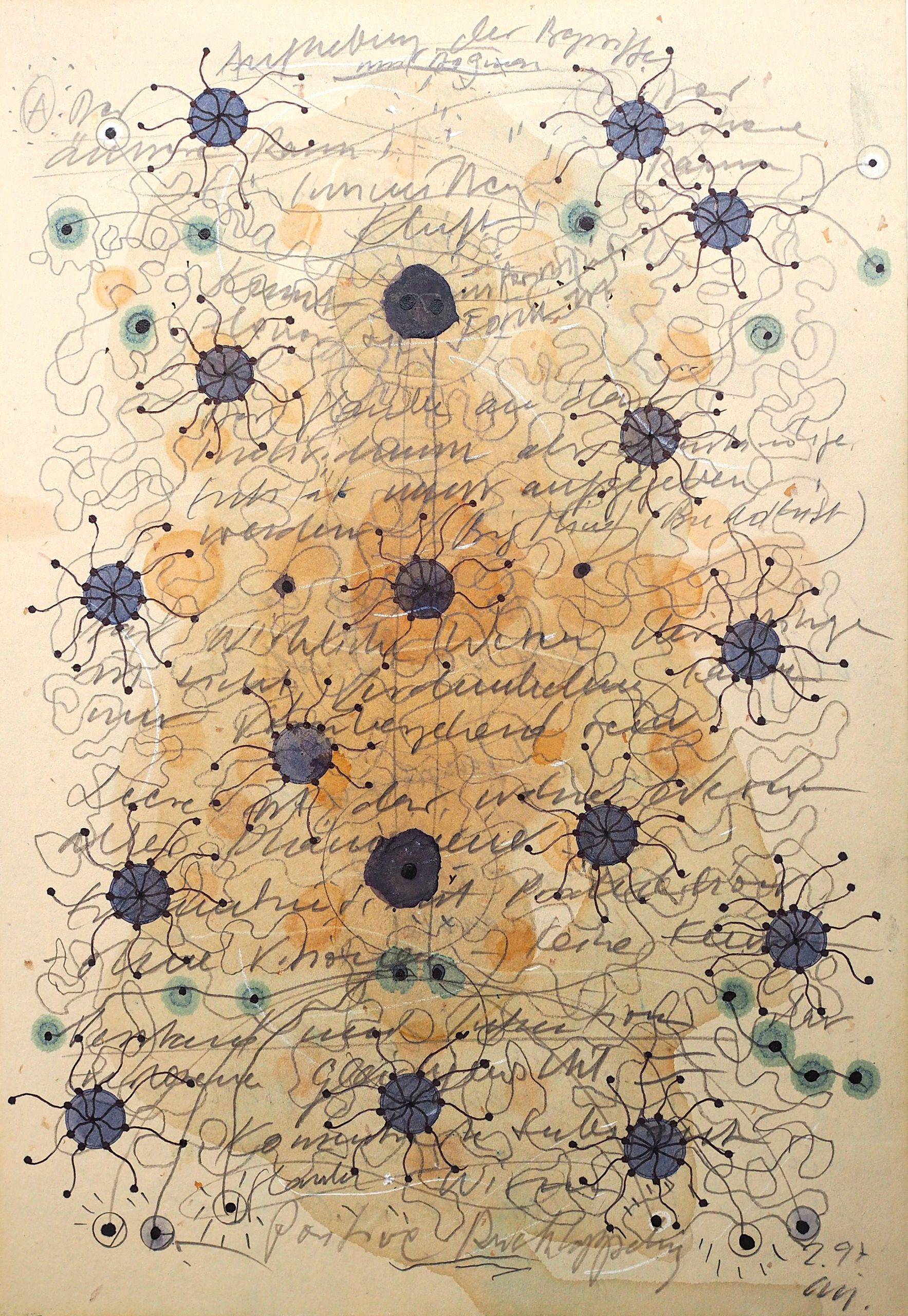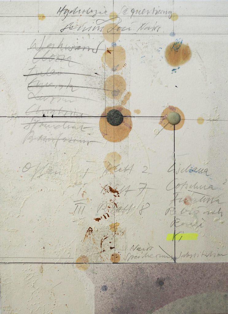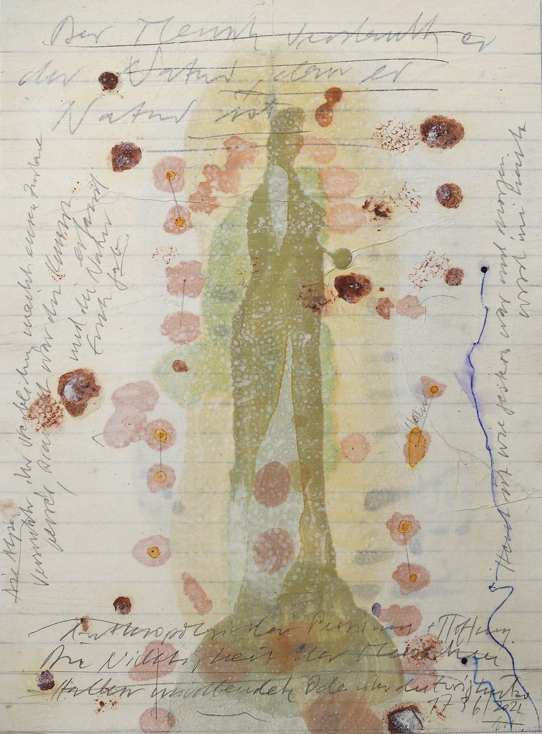 George Steinmann, Labile Ästhetik, 1997, Spring substance, linseed oil, dust, glue, sage essence, pencil on second sheet with blueberry juice, antiseptic, and pencil, 29.7 x 21 cm.