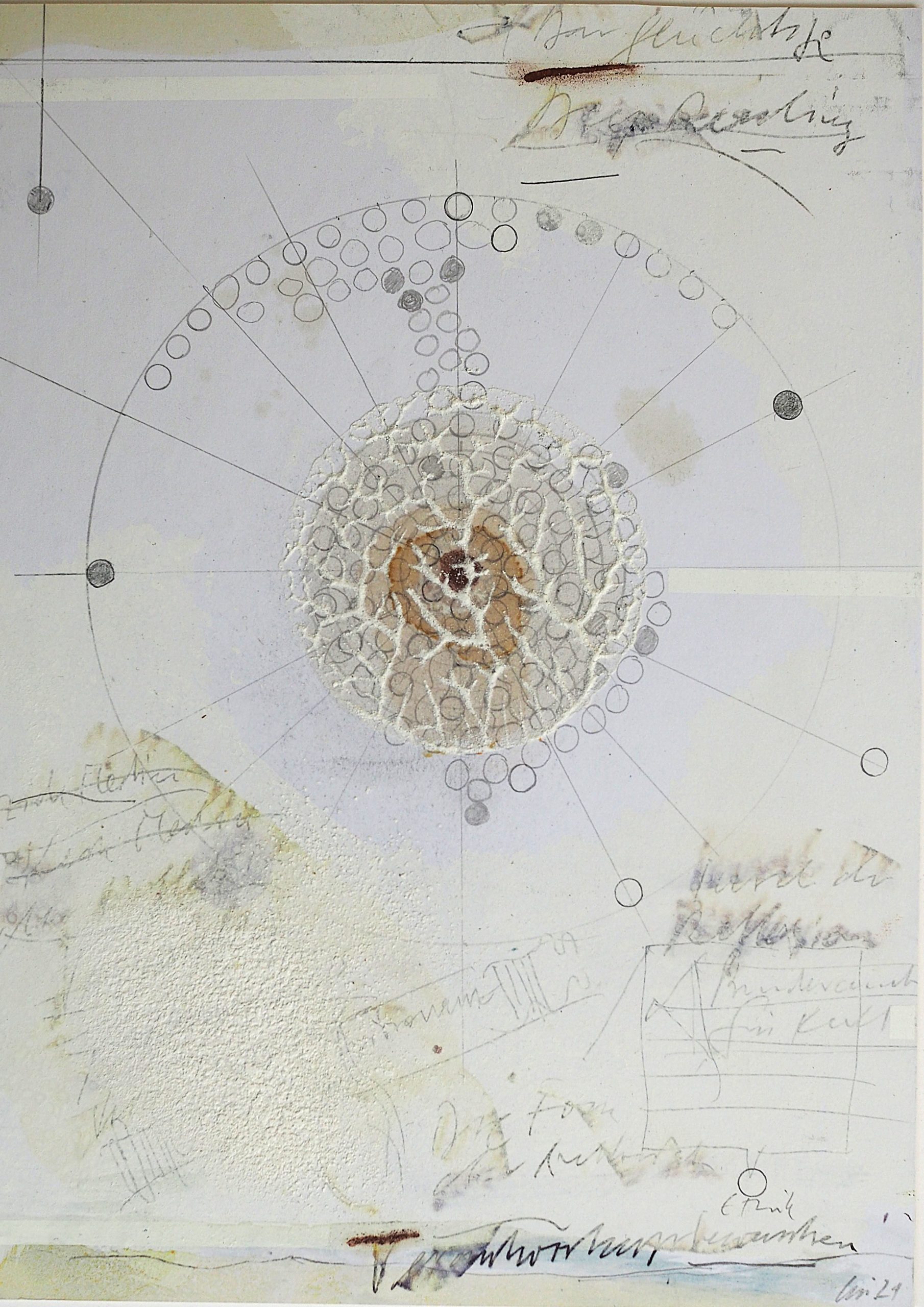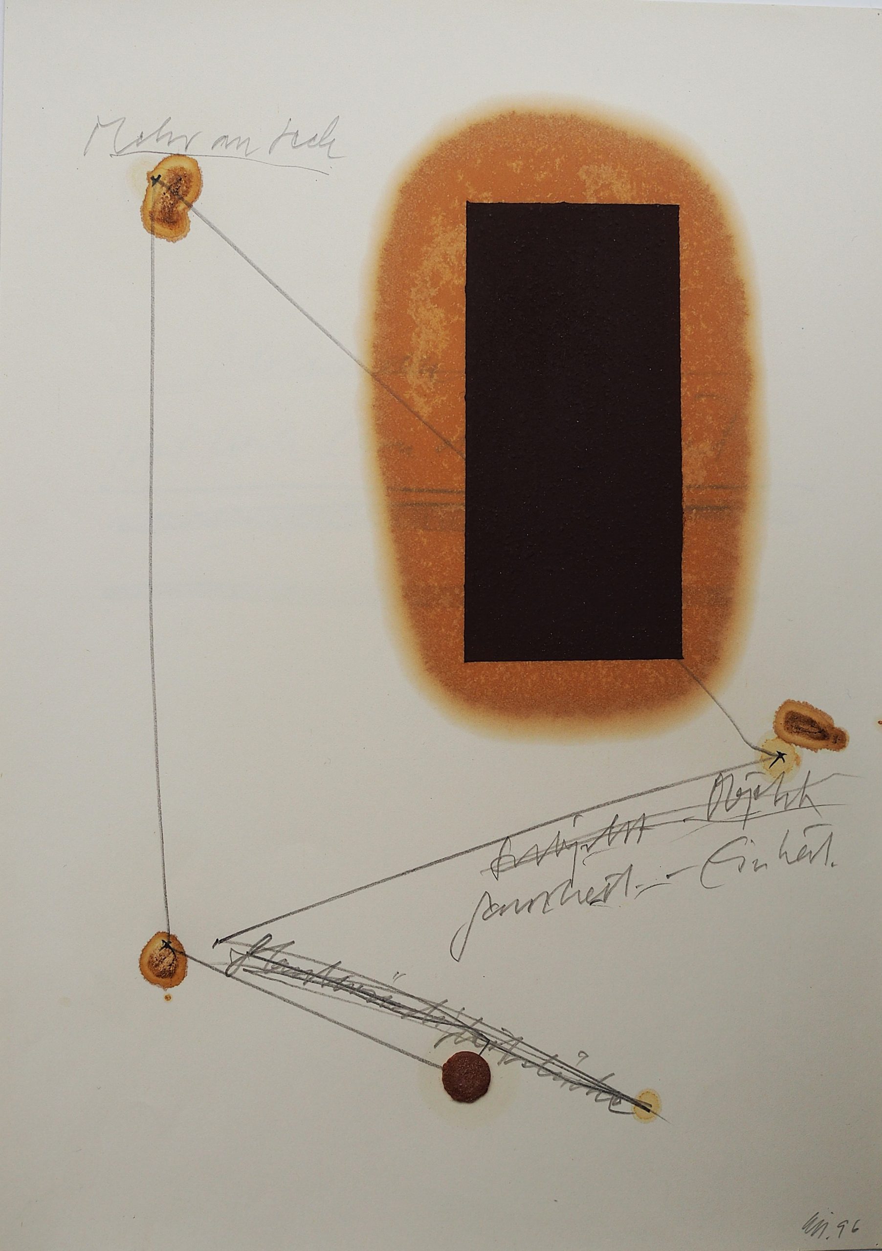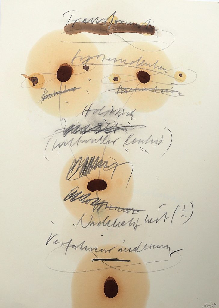 George Steinmann, Labile Ästhetik, 1997, Spring substance, linseed oil, dust, glue, sage essence, pencil on second sheet with blueberry juice, antiseptic, and pencil, 29.7 x 21 cm.