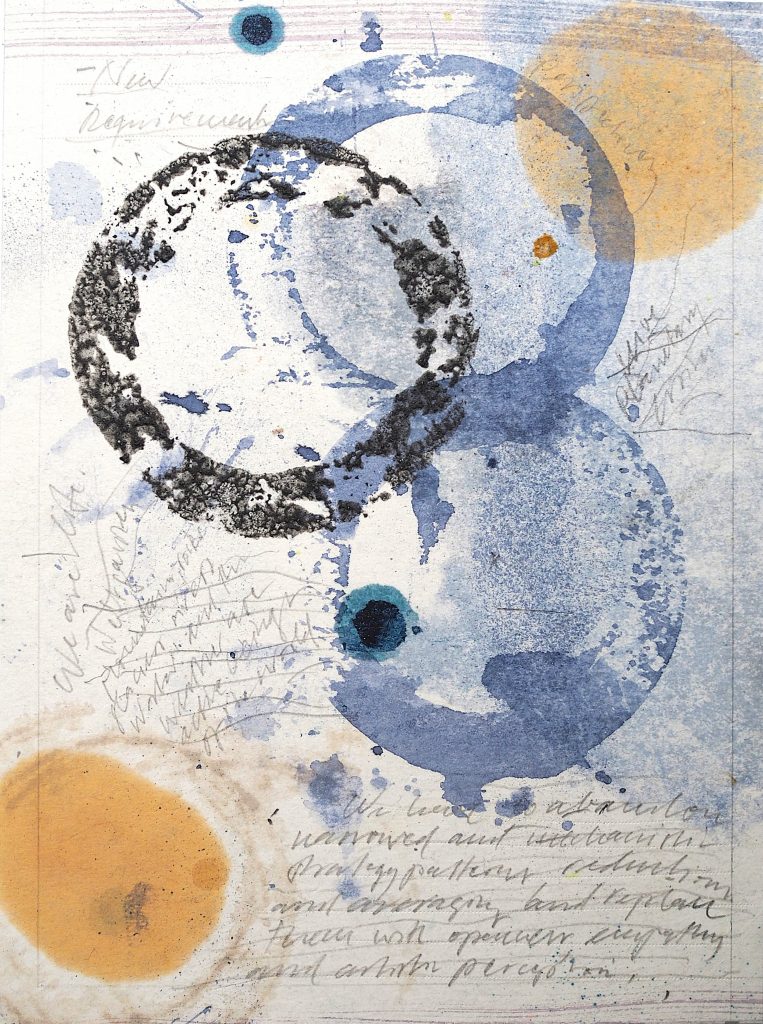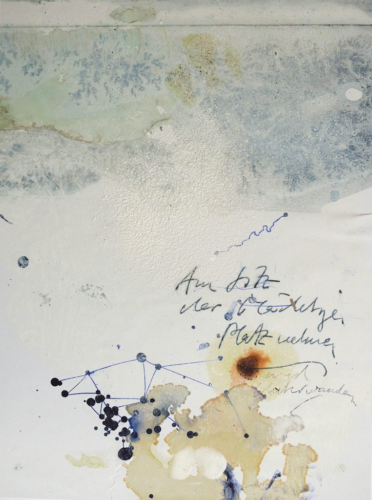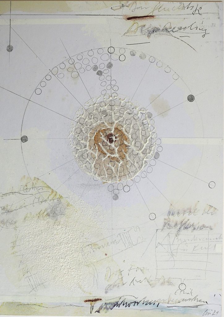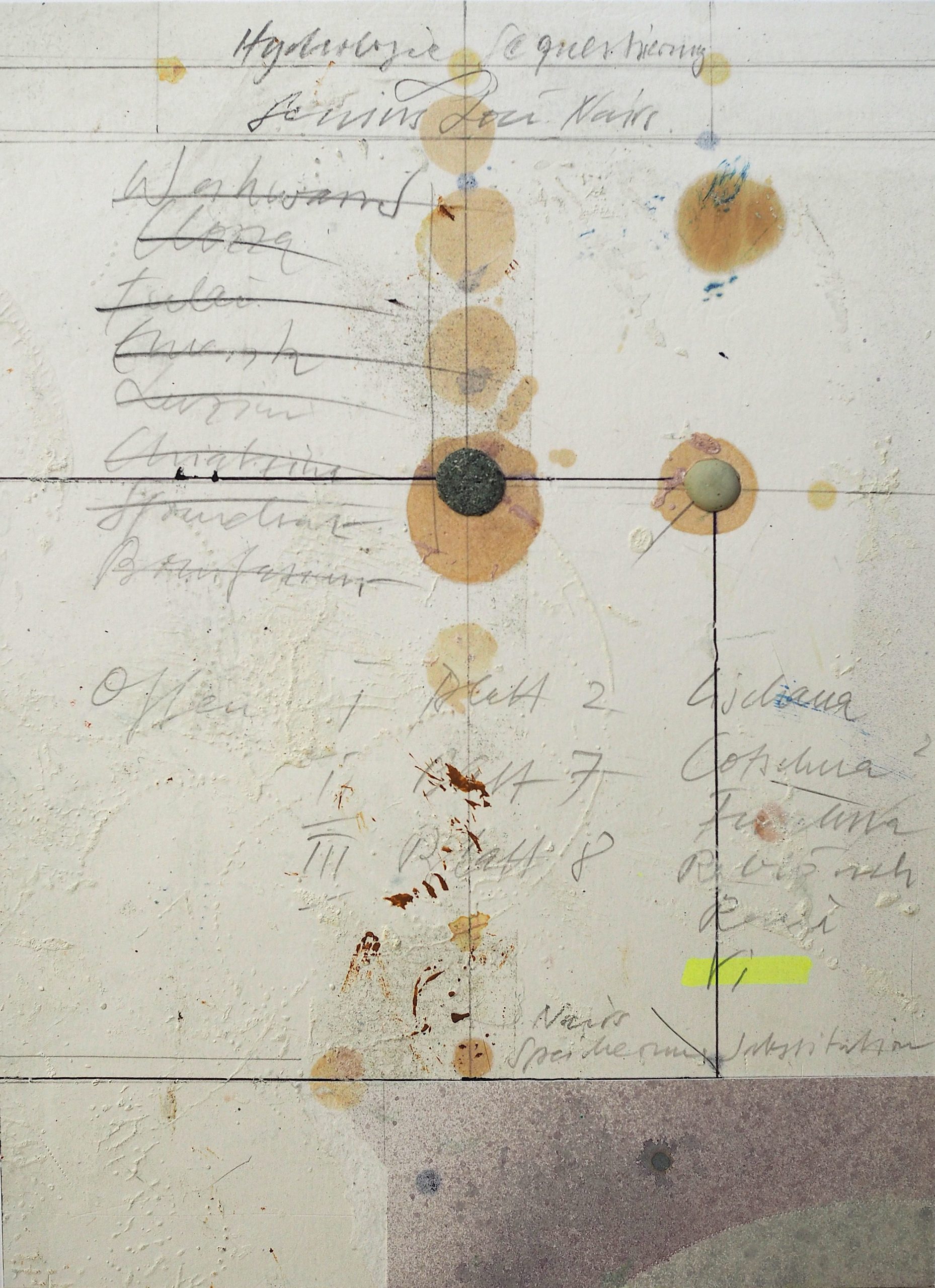 George Steinmann, Ethik und das Flüchtige (Aquapunktur), 2021, Pencil, marker, correction tape, spring substance, shellac, calcium hydroxide, 25.8 x 18.5 cm.