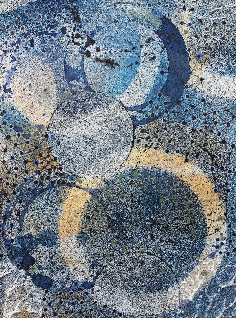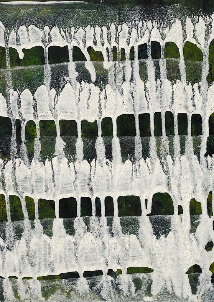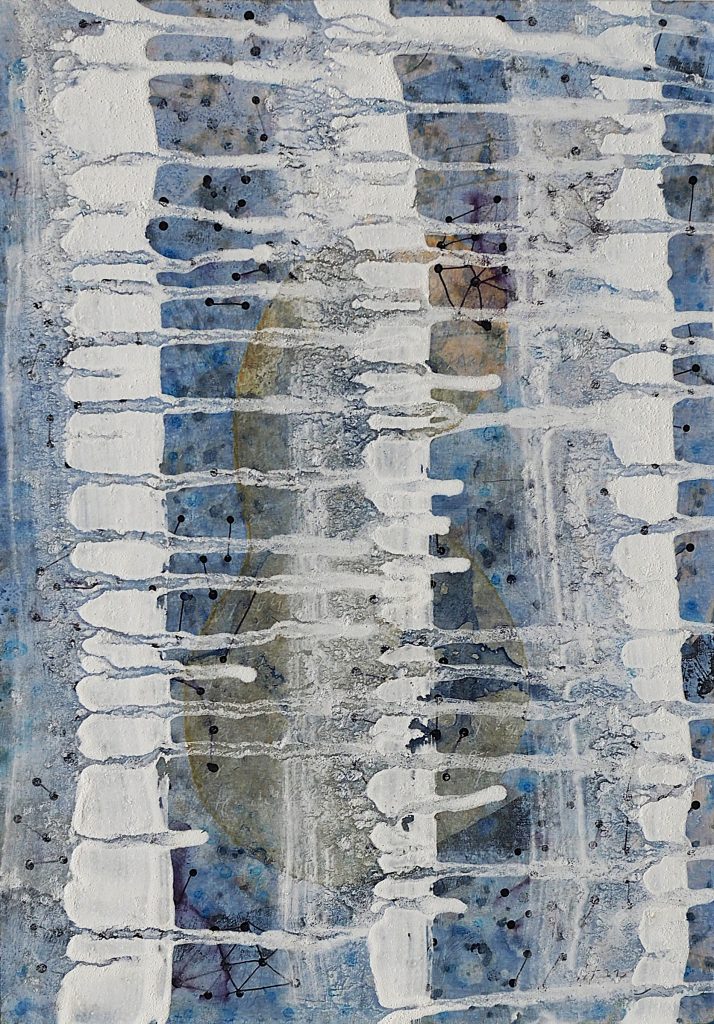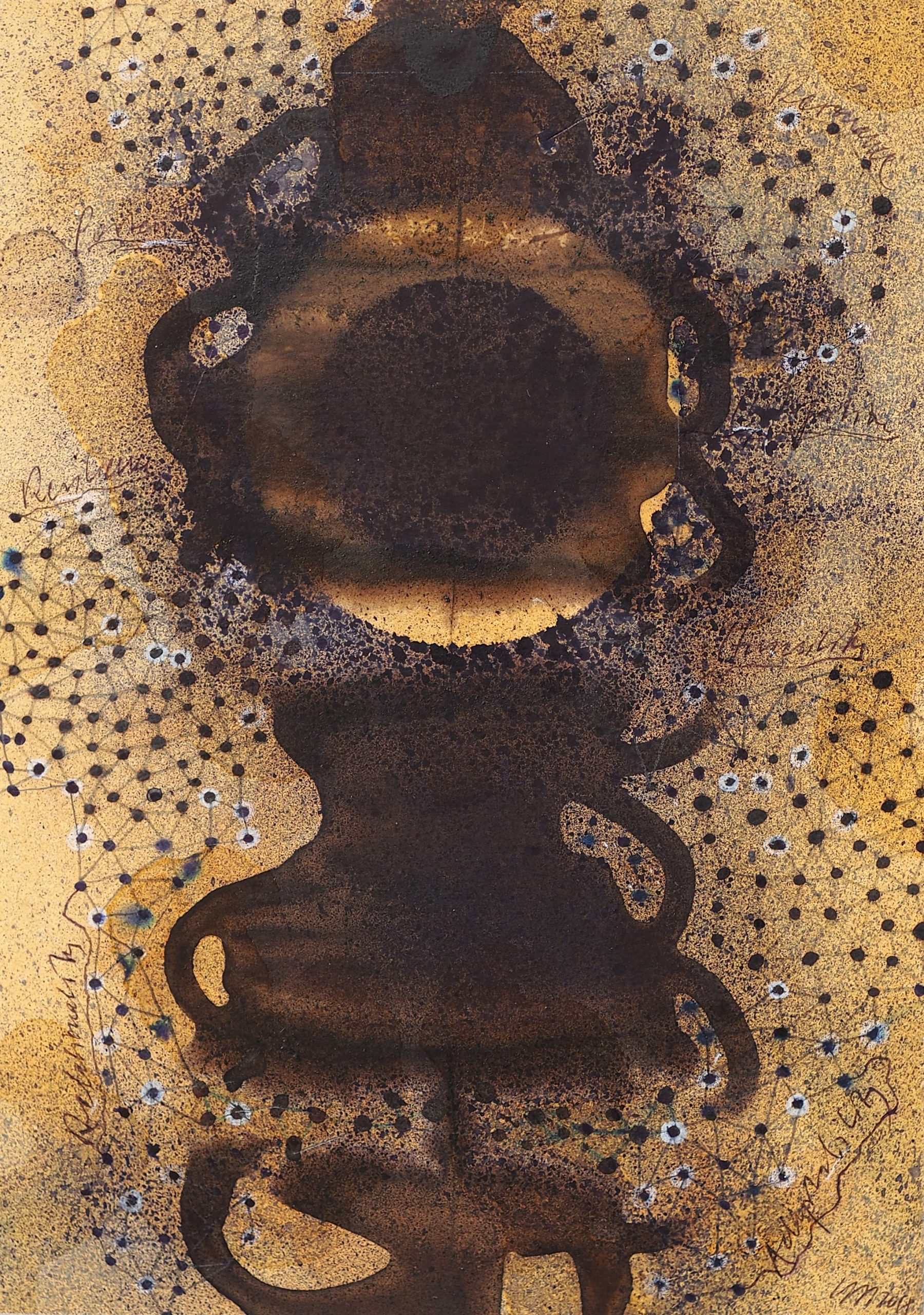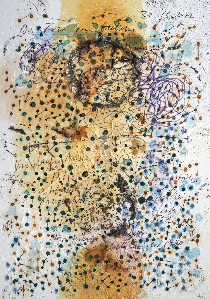 George Steinmann, Ethik und das Flüchtige (Aquapunktur), 2021, Pencil, marker, correction tape, spring substance, shellac, calcium hydroxide, 25.8 x 18.5 cm.