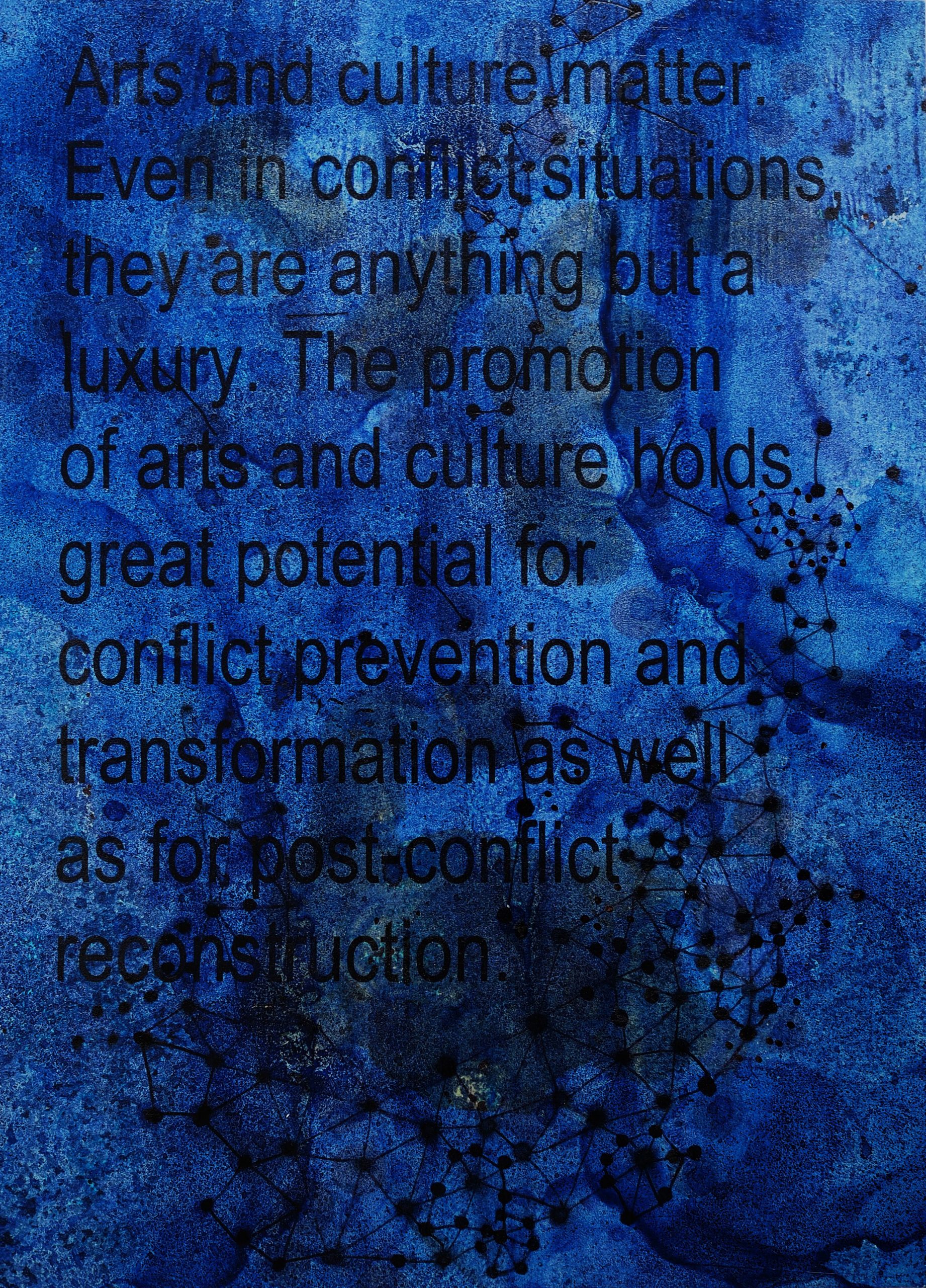 George Steinmann, Arts and Culture Matter, 2016/2022, Indigo, prussian blue pigment, shellac, rhatany essence, ballpoint pen on photocopy with text from GST, 26 x 19 cm.