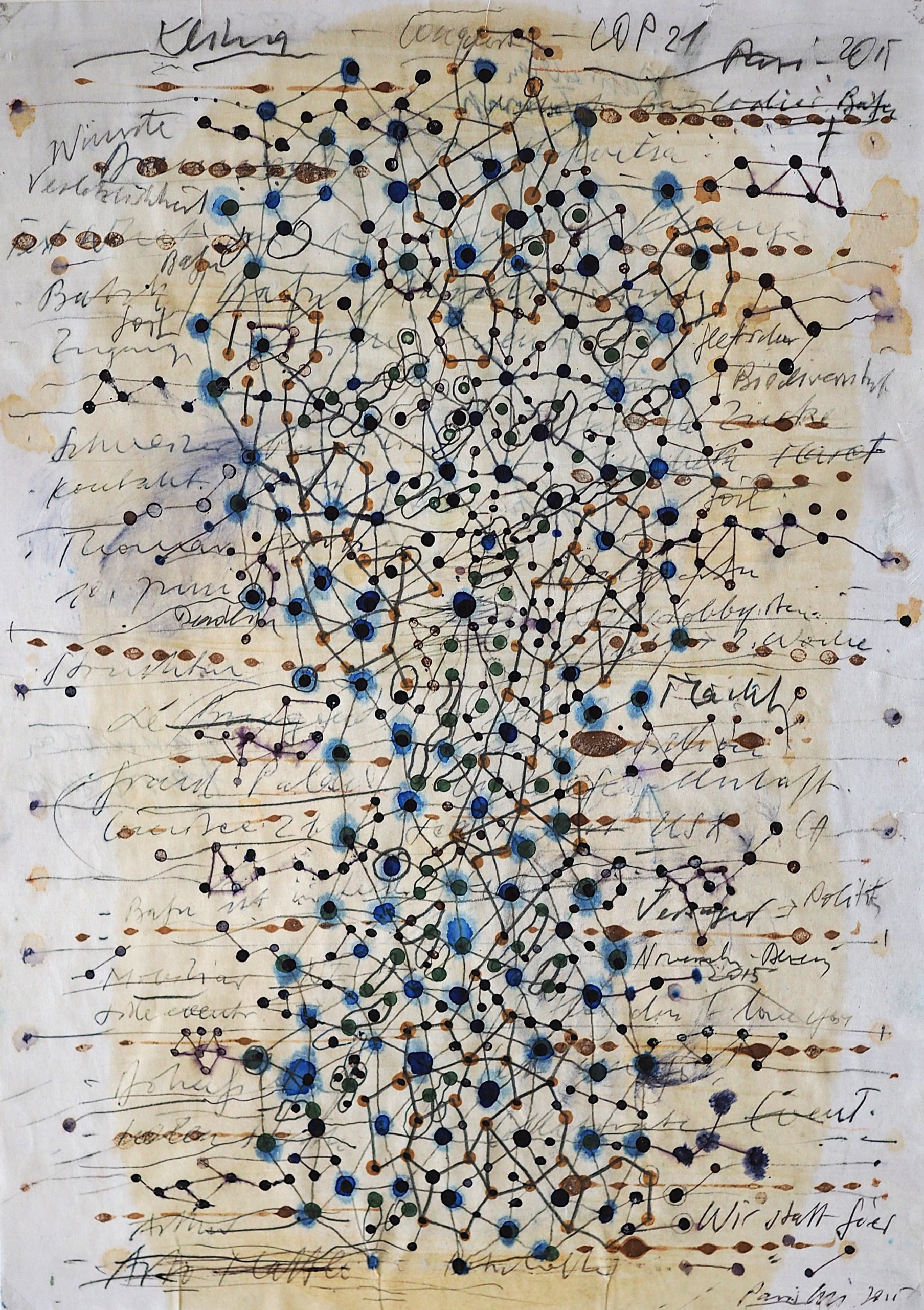 George Steinmann, COP21 Paris, 2015, Prussian blue pigment, fern juice, nettle juice, shellac, indigo, ballpoint pen, pencil, 29.5 x 21 cm.