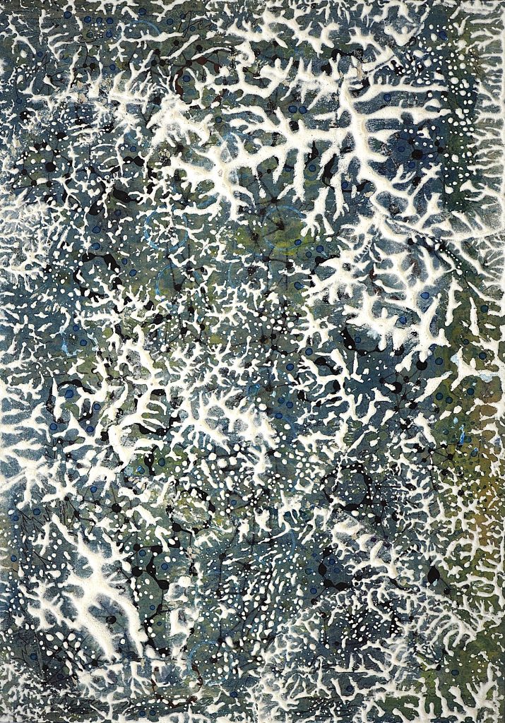 George Steinmann, Indikator, 1987/2006, Lichen juice, (Letharia Vulpina) Fern juice (Polystichum) pencil on handmade paper, 91 x 117 cm.
