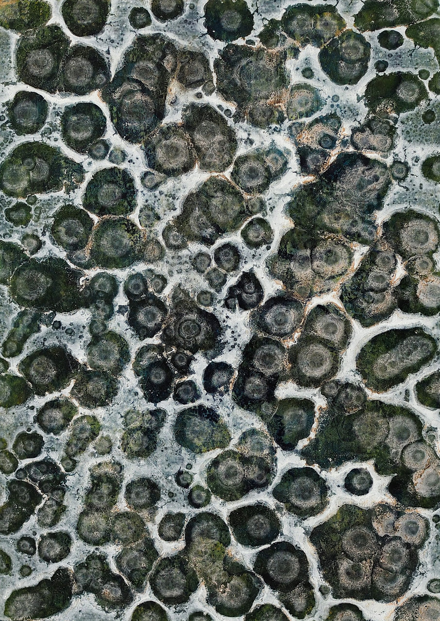 George Steinmann, Der Mensch verdankt es der Natur, dass er Natur ist, 2020/2021, Spring substance, shellac, rhatany essence, calcium hydroxide, ballpoint pen, pencil on fleese on paper produced with water from the Carola mineral spring, Tarasp, 25 x 18.5 cm.