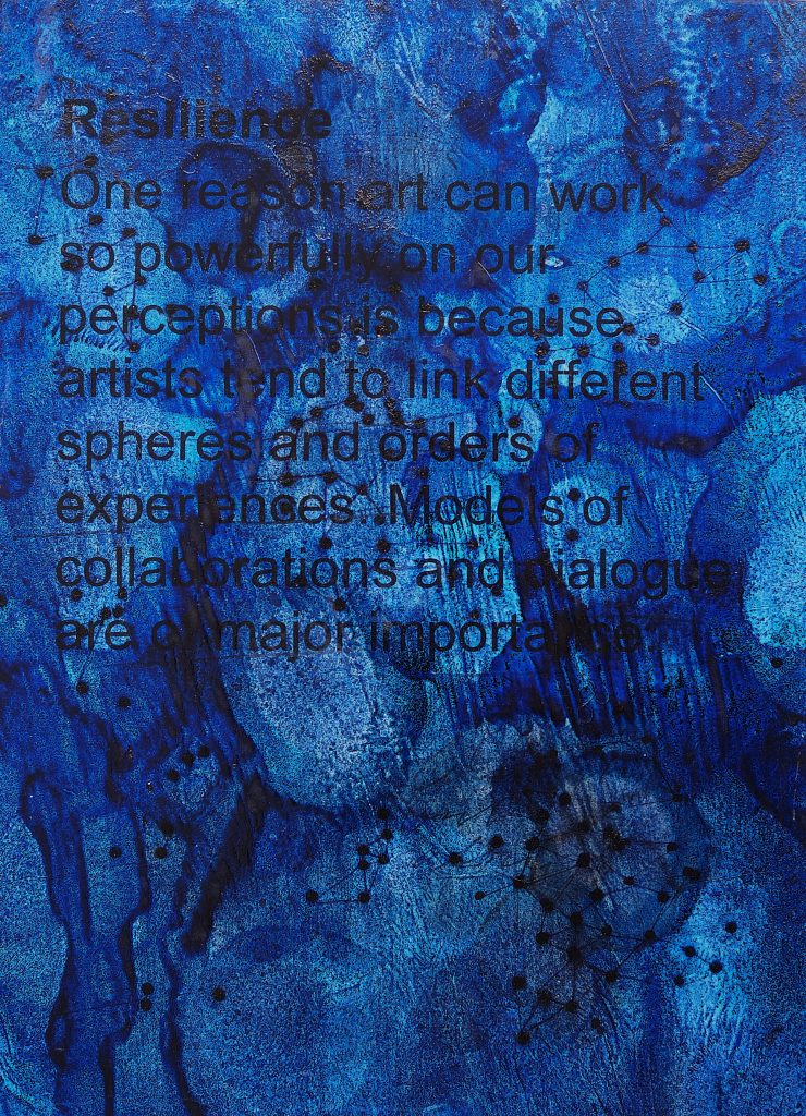 George Steinmann, Resilience, 2016/2022, Indigo, prussian blue pigment, shellac, rhatany essence, ballpoint pen on photocopy with text from GST, 26 x 19 cm.