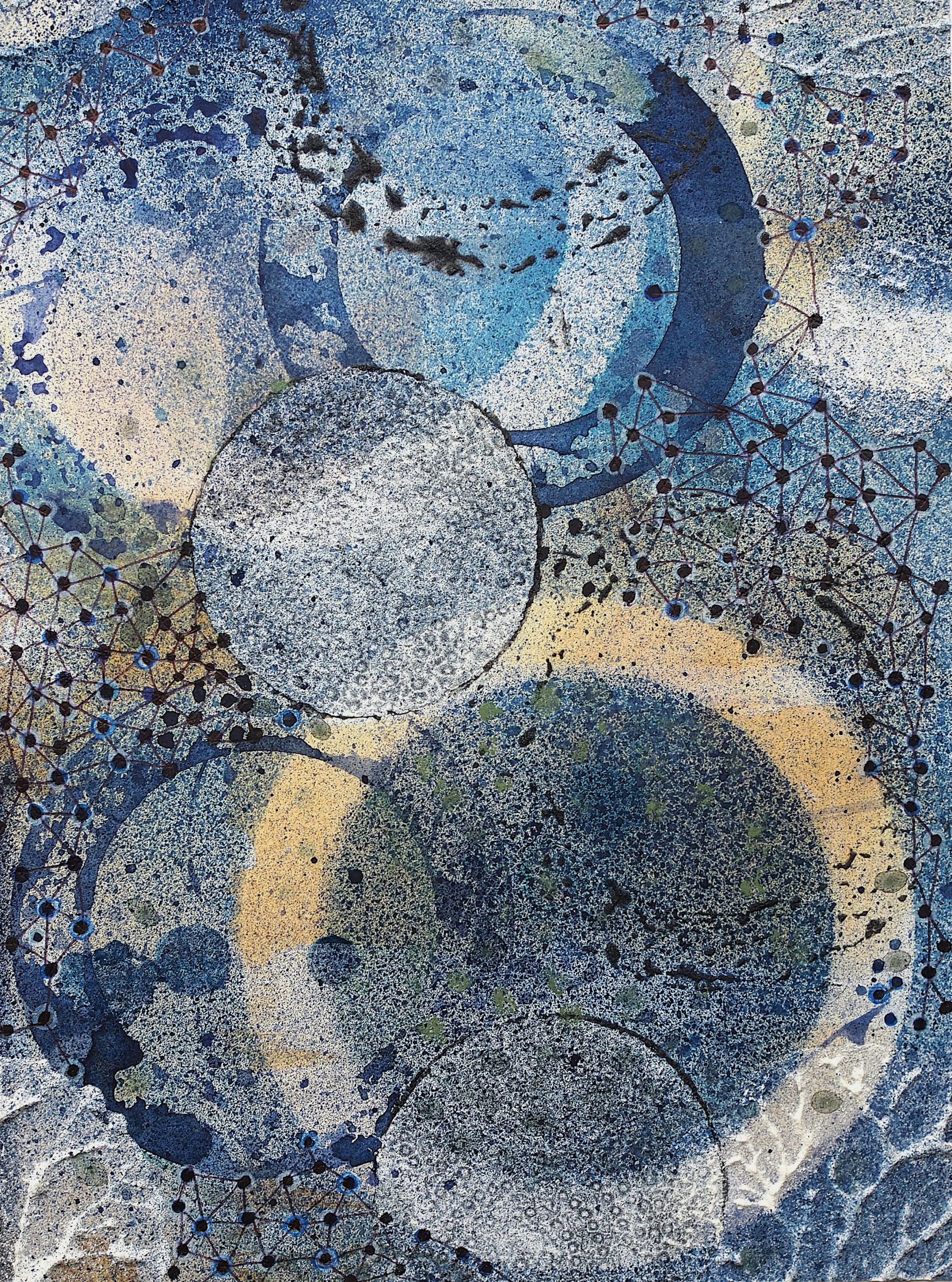 George Steinmann, Kunst als Rhizom, 2025/2021, Blueberry juice, acid yellow pigment, shellac, ballpoint pen, calcium hydroxide, rhatany essence, 29.5 x 21 cm.