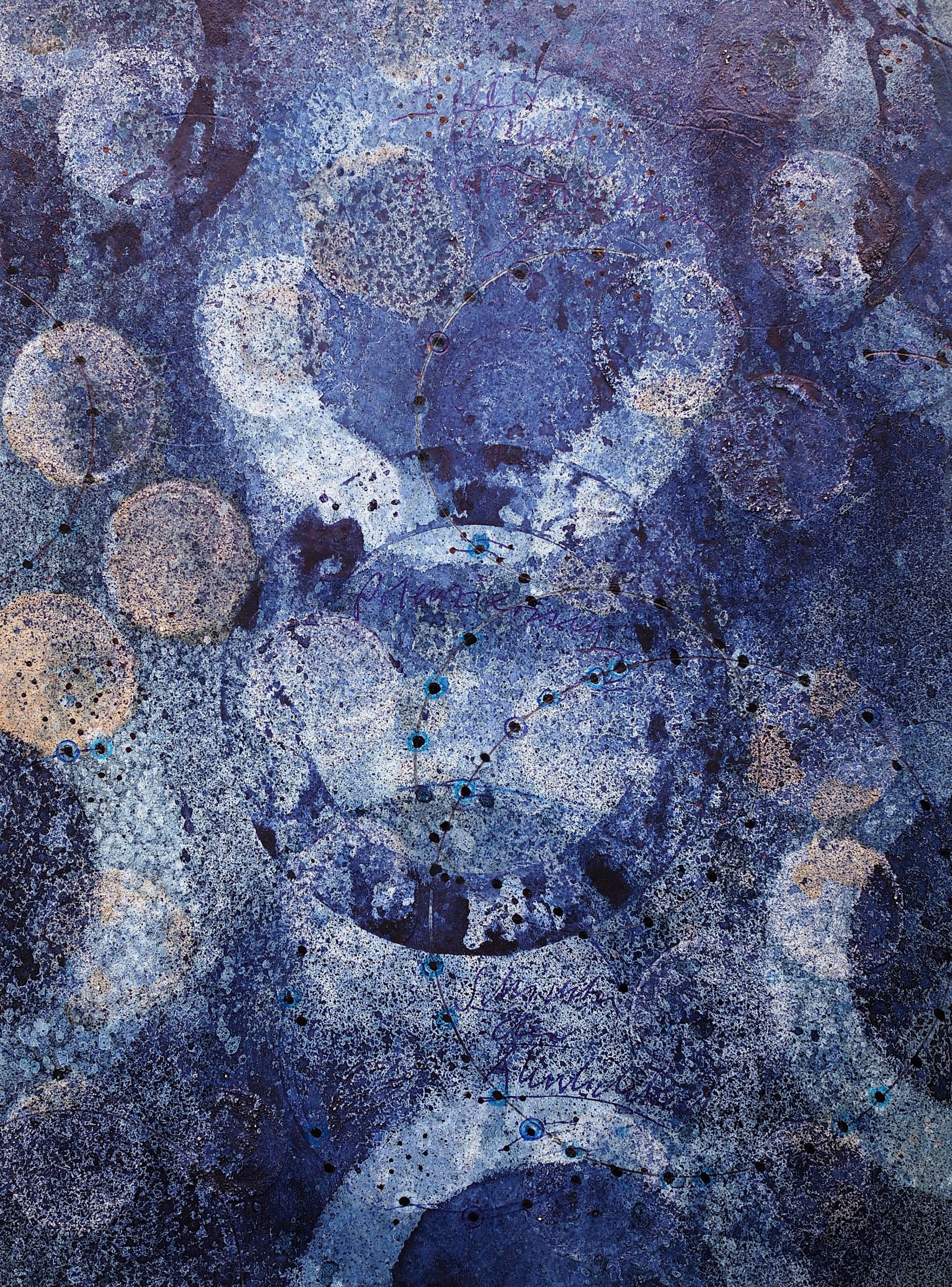 George Steinmann, Schichten der Ähnlichkeit, 2015/2020, Blueberry juice, indigo, rhatany essence, calcium hydroxide, Prussian blue pigment, ballpoint pen, 25 x 18.5 cm.