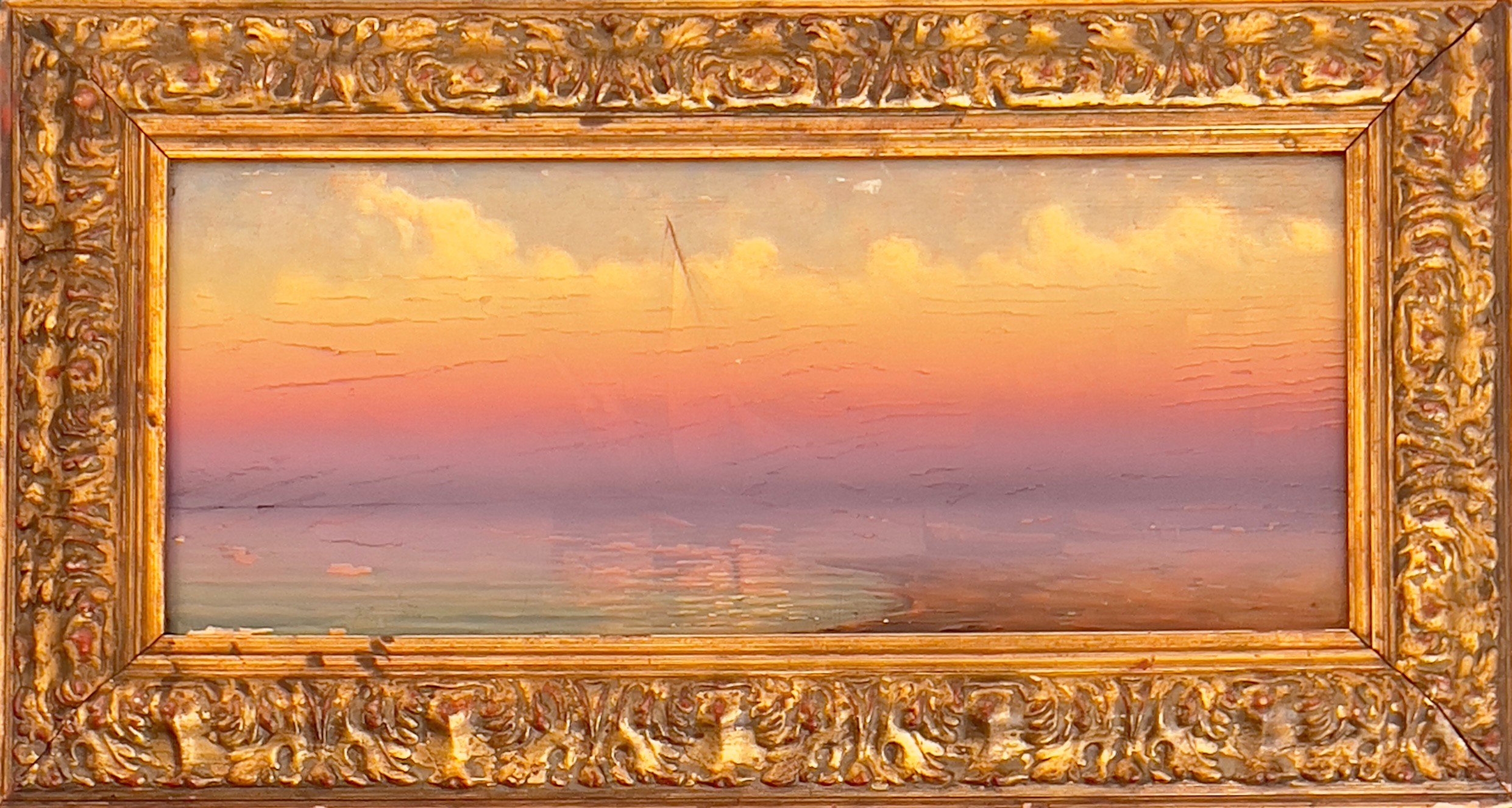 Mathias Kessler, After J.M.W. Turner: Seascape with Burning Hulk II, 2023, Airbrush on Alu-Dibond,with a walnut painter's frame, 24.1 × 41.6 cm