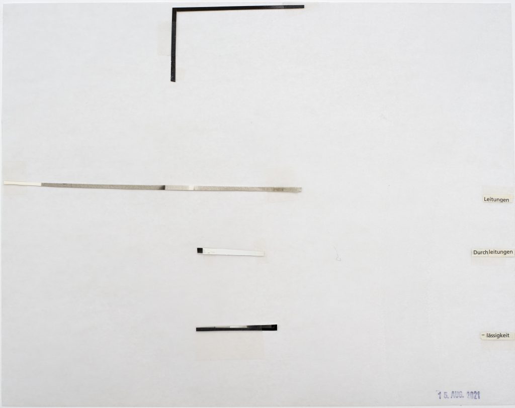 Monika Brandmeier, Kennzeichensystemreperatur, 2021, photograph adhesive tape und Textfragmente auf Wachspapier, 24 × 30 cm