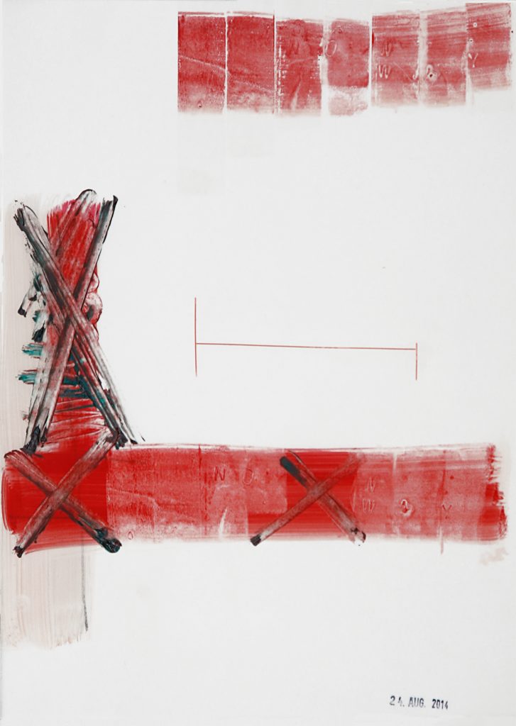 Monika Brandmeier, No Way, 2014, Ölfarbe, Stanzeisen und Klebeband auf Wachspapier, 30 × 24 cm
